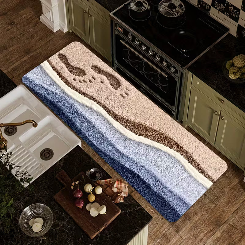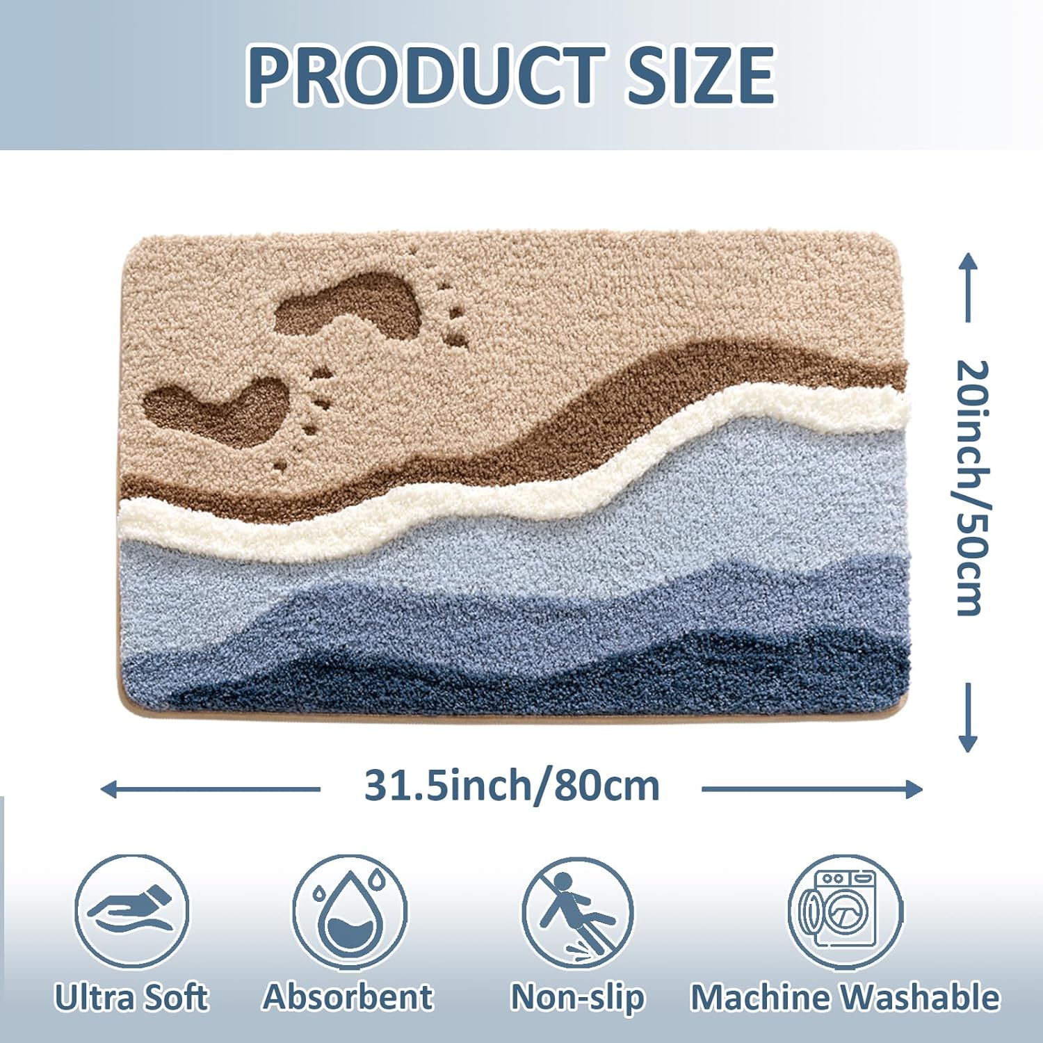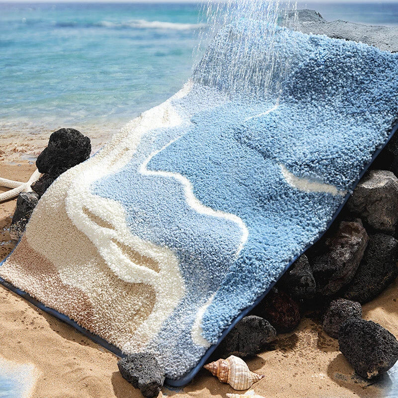 This beach-themed bath mat features serene ocean waves and natural sand footprints, bringing a relaxing seaside vibe to your bathroom. The elegant yet playful design enhances your space with a touch of nature-inspired charm.