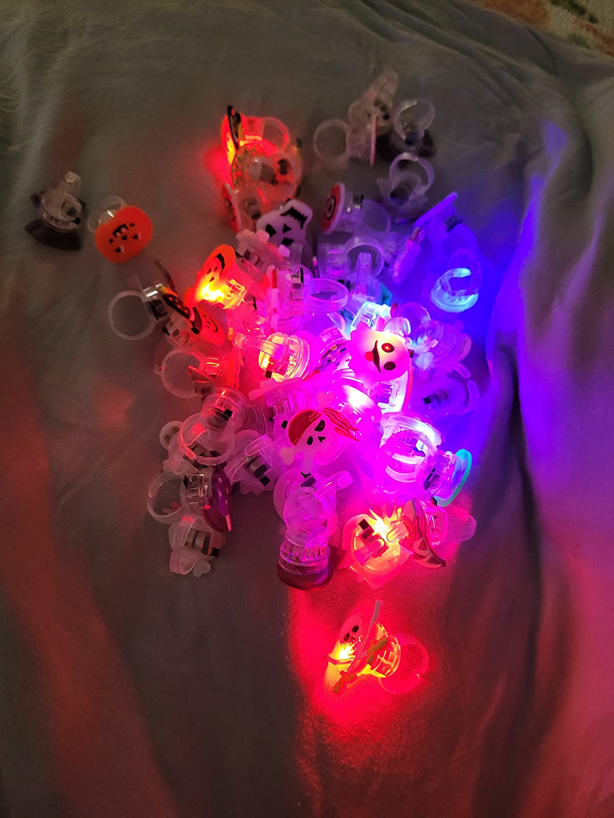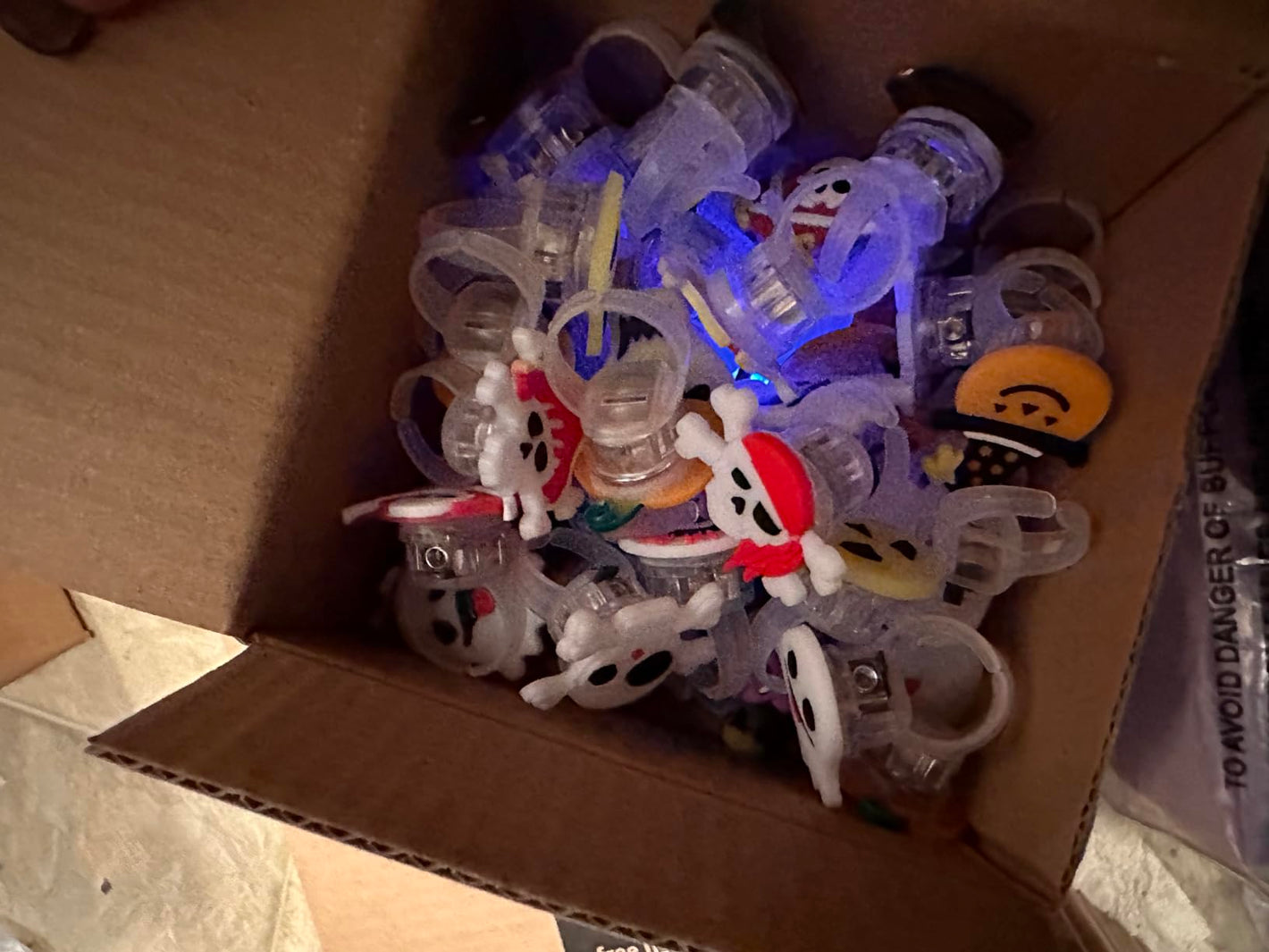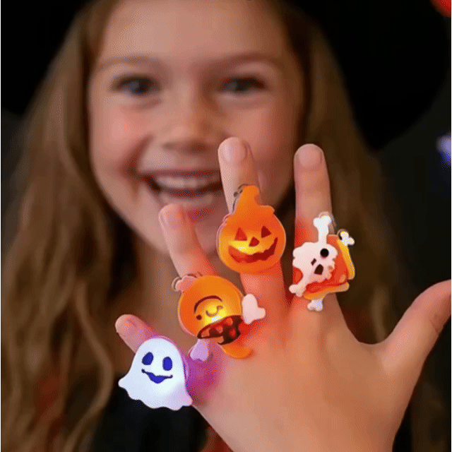 • Bullet 50pcs LED rings – Pumpkins, ghosts, skulls, bats, & more.
